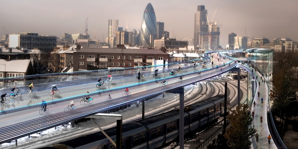 London SkyCycle by Foster + Partners (pictured above) is an ambitious plan that proposes a 136 mile network lofted above existing suburban rail lines. There would be 200 entry points, serving 2M people that live in the area it’d cover. According to F + P, following railways is ideal because the tracks were originally built for steam engines, who had to find the easiest, flattest route around the city.