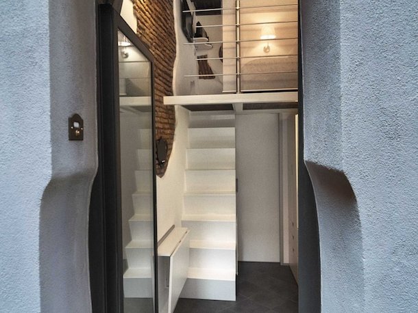 We’ve seen some pretty damn small apartments on this site. There was Felice Cohen’s 90 sq ft studio, Steve Sauer’s 183 sq ft triplex and countless tiny houses, the latter of which rarely break the 200 sq ft mark. But this 75 sq ft apartment in Rome might just take the prize for smallest home we’ve ever seen. The tiny space houses an actual kitchen, bathroom, dining area, a decent amount of storage and a loft for sleeping and lounging loft.