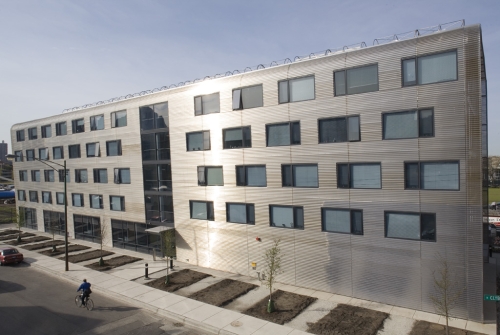 It is LEED silver certified, has solar panels and wind turbines that generate 15% of the buildings power and a grey-water recycling system (the first of its kind in Chicago). The ground floor features a large community space and the four top floors feature bright and airy units whose average size is 300 sq ft. Many of them feature views of downtown Chicago.