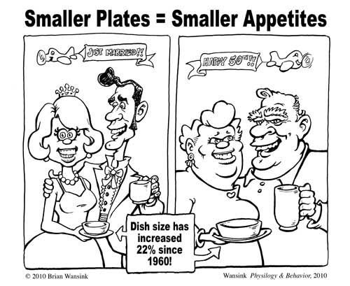 - Reduce your portion size. This is a topic we explored a while back with the “Small Plate Movement,” which promotes using smaller plates to help us eat less. One study the movement cites says that people will eat 70% of their plate’s portion, regardless of the plate’s size–and 70% of a 10” plate is less food than 70% of a 14” plate, right? I’ve read some of the research and it’s not quite as compelling as the other suggestions on this list, and it doesn’t necessarily jibe with my experience (I have little shame about getting seconds). That said, it might save room in our cupboards and it certainly can’t hurt.