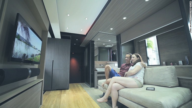 With an average purchasing price around $23K per square meter, it’s no wonder that some of the world’s most amazing transforming spaces come from Hong Kong. And this apartment by HK’s LAAB Architecture might be the most most versatile transforming space we’ve ever seen. The owners, Michelle and Andy, were dead set on living in HK’s extremely expensive Central District. Rather than cashing blowing all of their money on a larger place, they decided to go small and employ smart design to fulfill on their desires. And their desires were many: They wanted a full kitchen, large bathtub, home cinema, gym, cat friendly spaces (there are three) and plenty of storage. All in 309 sq ft.